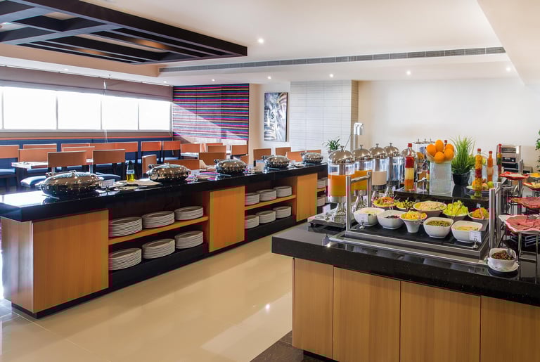 At V Hotel Fujairah, we believe a great day begins with a great breakfast. Join us each morning for our inviting breakfast buffet, where a variety of delicious options await to satisfy every palate. Served in our all-day dining restaurant, the buffet features a diverse selection of international and regional favorites — from fresh fruits, pastries, and cereals to hot dishes, eggs made to order, and traditional Arabic delicacies. Whether you prefer a light start or a hearty meal, our breakfast spread is designed to energize and delight. Begin your day with flavor, freshness, and a warm welcome.