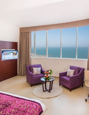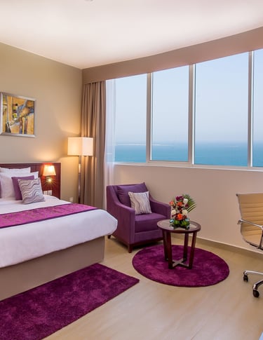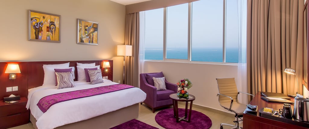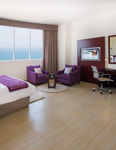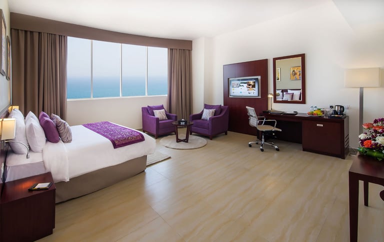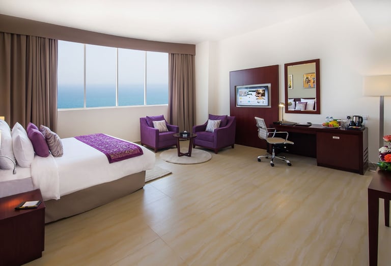 Magnificent sea-view, mountain/city-view, spacious 82 m2 . 1 Extra-King Bed (200×200 cm) with excellent office chair and writing-desk, telephone, two flat-screen televisions 40″ & 48″, sofa set for four with a coffee-table. Available on the 10th floor. Contemporary style designed two large bathrooms with bathtub, shower and amenities. Ideal for family stays, business trips and leisure. Complimentary Wi-Fi. At the V Hotel, a top 4 star hotel, the 241 rooms – including standard rooms, deluxe rooms and suites up to 3 bedrooms – are luxuriously designed with your comfort in mind. The rooms boast spectacular views of the Arabian Sea and the Hajar Mountains, and are evenly suitable for both business and leisure travellers. Located just an hour away from Dubai International Airport, the V Hotel awaits you as the perfect destination for your travel needs! The hotel offers 24-hour room service. Non-smoking rooms are available on request.